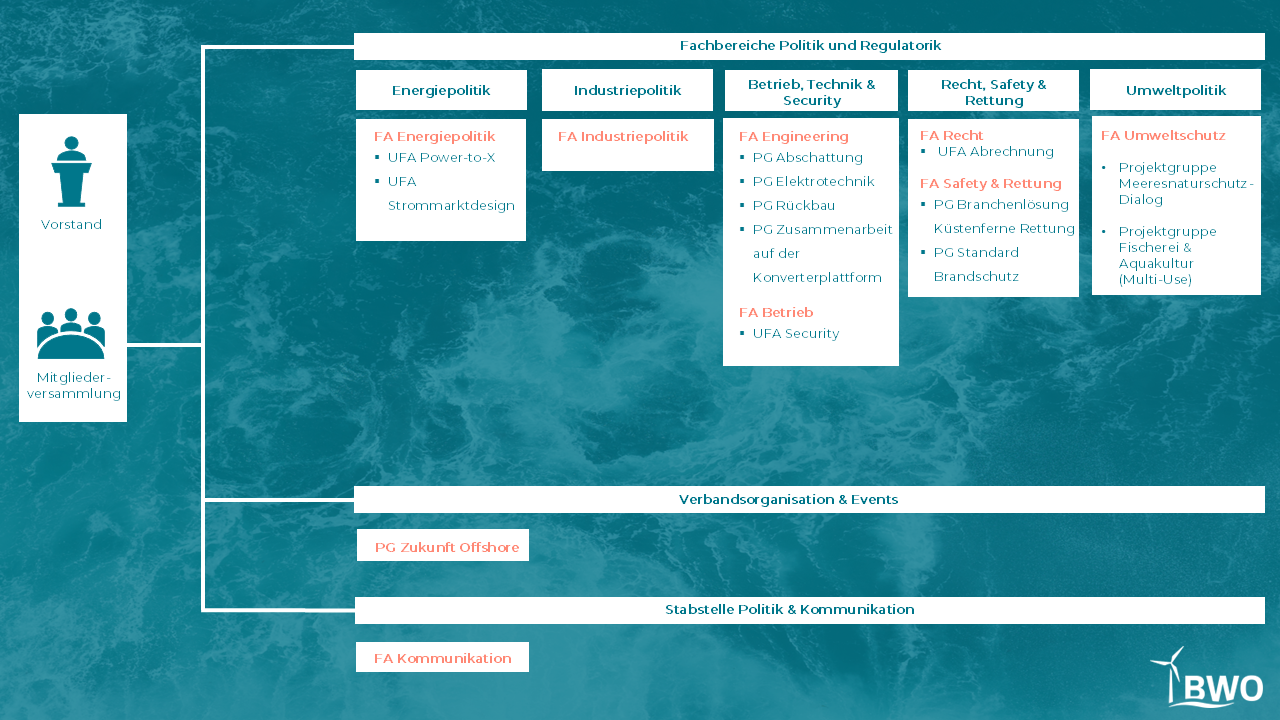 Der BWO ist die politische Interessenvertretung der Offshore-Wind-Branche in Deutschland. Wir bündeln die fachliche Expertise der Unternehmen entlang der gesamten Wertschöpfungskette, von den Herstellern über die Entwickler und Betreiber bis hin zu den Dienstleistern der Offshore-Windenergie. Der BWO setzt sich dafür ein, die politischen, regulatorischen und ökonomischen Rahmenbedingungen für den Ausbau der Offshore-Windenergie im Sinne der Energiewende zu verbessern. Der BWO ist für politische Akteure auf Landes- und Bundesebene zentraler Ansprechpartner zu allen Fragen der Windenergie auf See. Der BWO wertet aktuelle Entwicklungen aus und analysiert die Folgen künftiger regulatorischer Rahmenbedingungen.